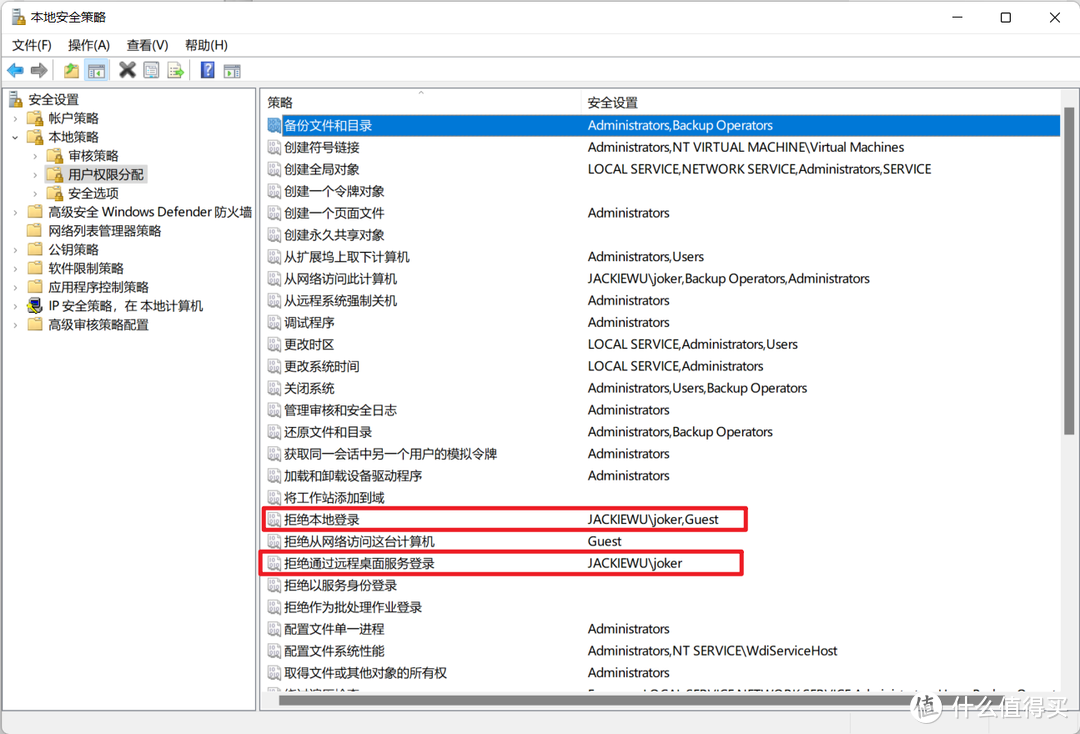 - 拒绝本地登录:即不允许特定用户在本电脑上进行登录