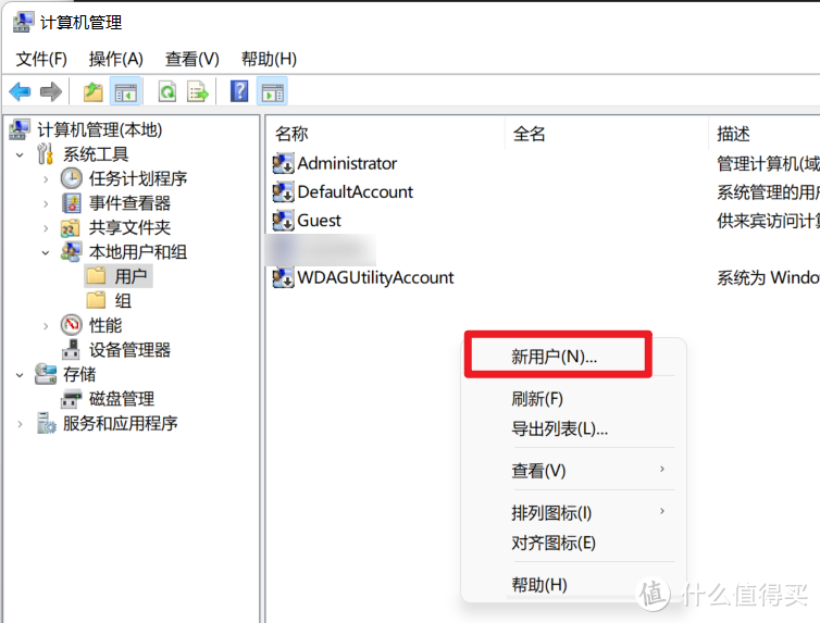 本地用户和组⇒ 用户⇒ 右键空白处,点击“新用户”