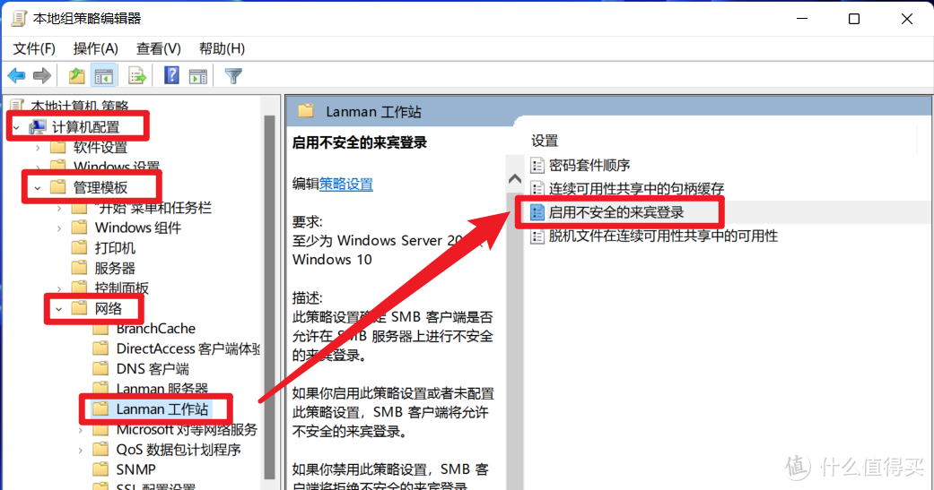 管理模板⇒ 网络⇒ lanman工作站⇒ 启用不安全的来宾登录⇒ 已禁用