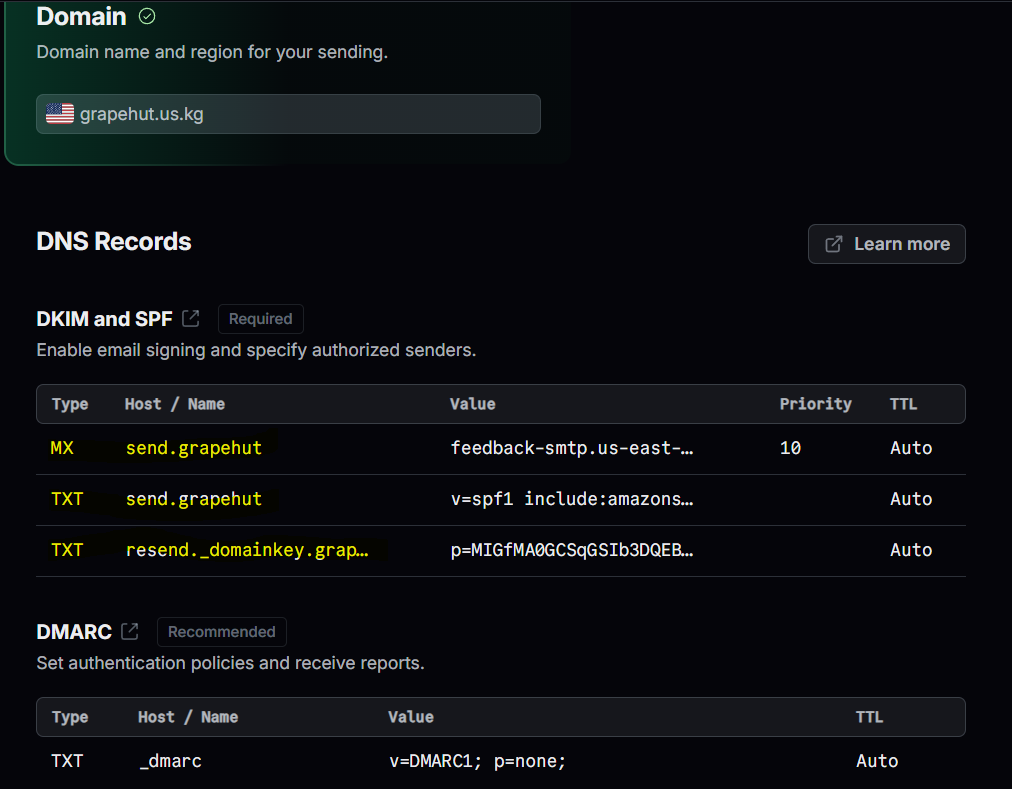 Add Domain,自动生成3条DNS(1条MX,2条TXT)